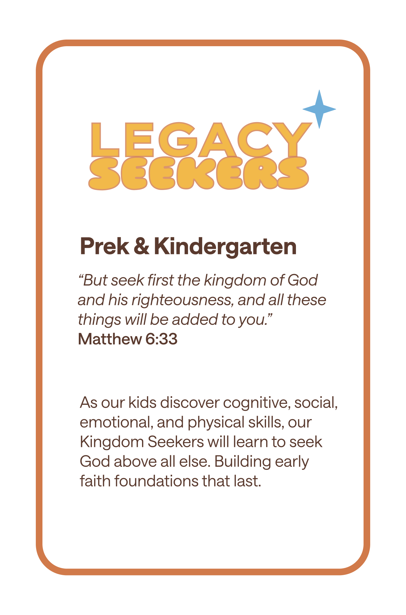 • Heirs: Infants and Toddlers, Seekers: PreK-K, Builders: Elementary.